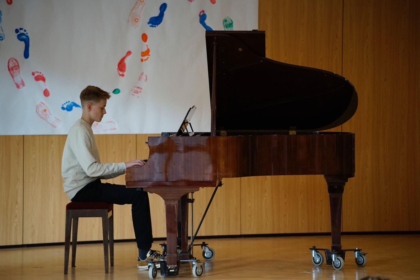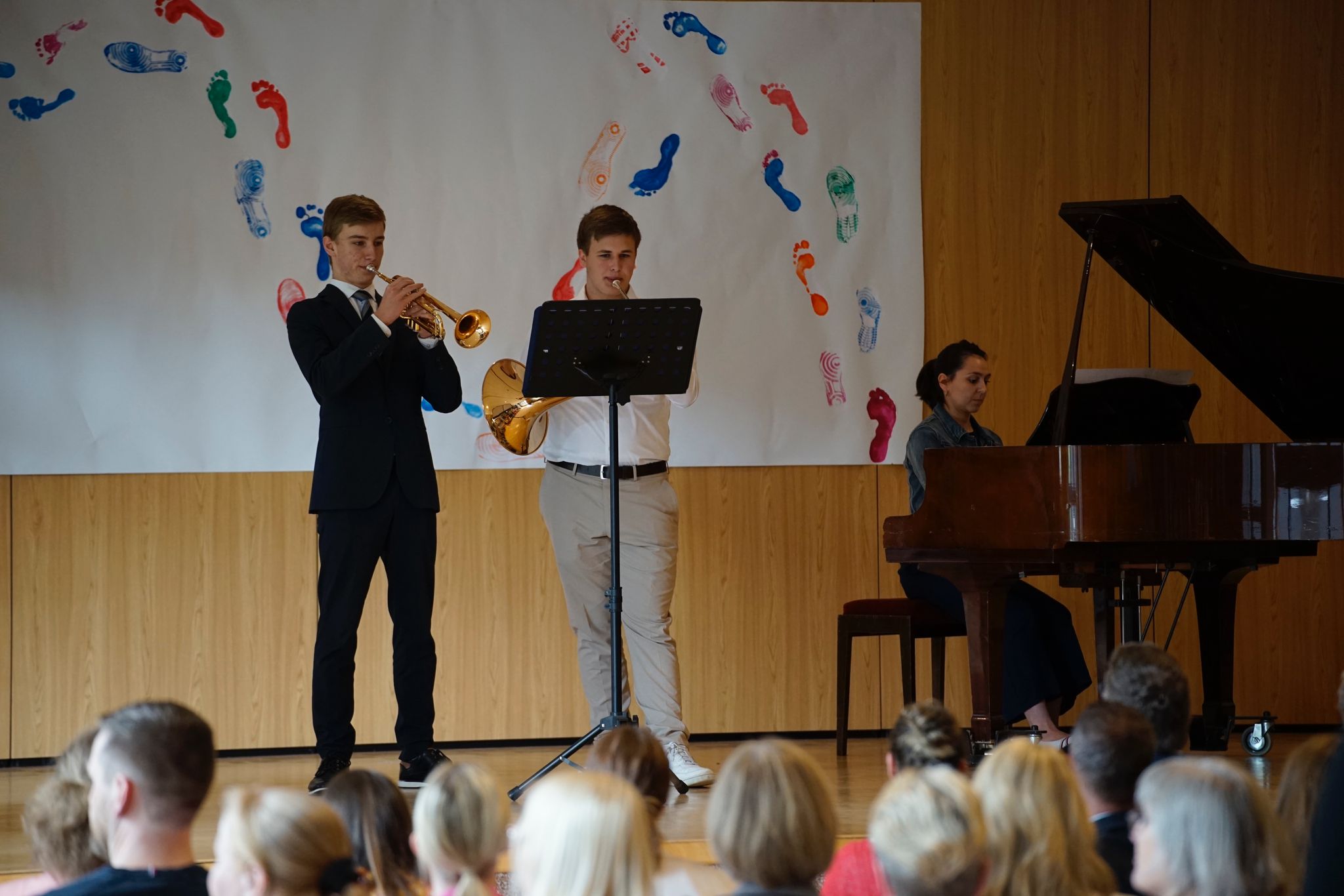 Das hätten die diesjährigen Absolventen hervorragend gemeistert. Sie seien nicht nur mit gerichtetem Krönchen weiter gegangen, sie hätten mit ihren Persönlichkeiten und Fähigkeiten auch unverwechselbare Fußabdrücke hinterlassen. Und einen Eindruck von den vielfältigen Begabungen und Fähigkeiten erhielten die Anwesenden bei der Abschlussfeier auf unterschiedlichste Weisen: Alina Heidebrecht (10c) und David Paul (9a) verzauberten die Anwesenden am Klavier, wobei David mit seinem einfühlsamen, bewegenden Spiel die Zuhörer nach seinem zweiten Auftritt zu standing ovations hinriss. Auch Luca Dimmel und Daniel Majs (10b) begeisterten das Publikum an Trompete und Horn, während Lehrerin Lore Rosenke