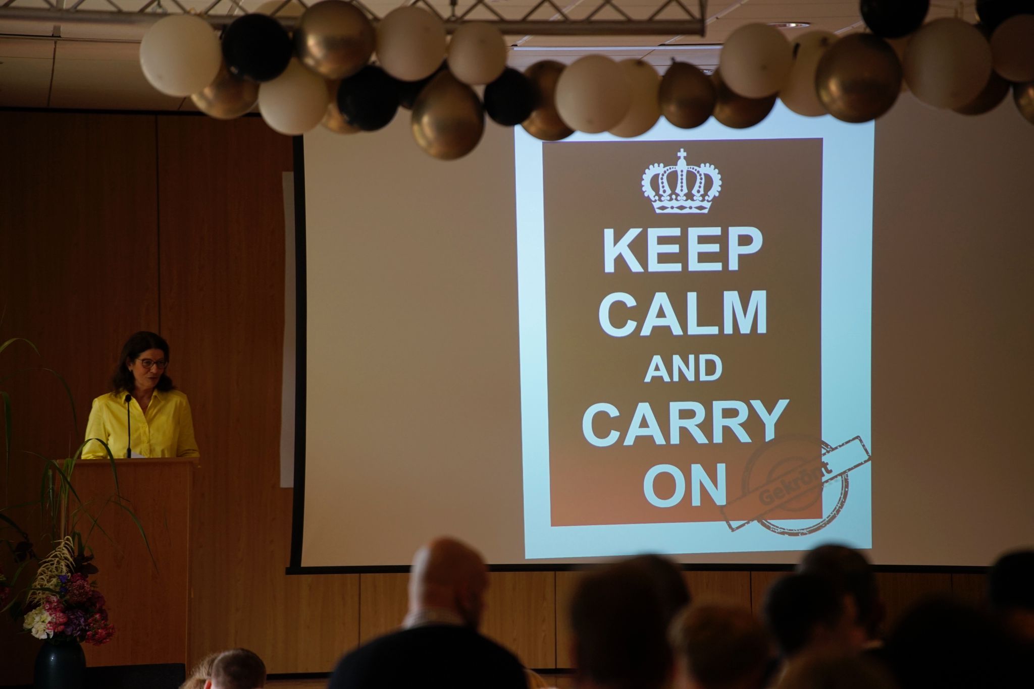 Schulleiterin Gabriele Balgenort verwies in ihren „Gedanken zur Entlassung“ auf die turbulenten Anfangsjahre: „Ihr wurdet hier eingeschult und musstet nach einem halben Jahr zuhause bleiben.“ Corona beherrschte das Tagesgeschäft, homeschooling war die neue Normalität. An den Folgen werde bis heute geforscht, doch dass vieles nicht optimal gelaufen sei, stehe schon fest. „Einer Studie zufolge hat das Gefühl der Einsamkeit unter den Jugendlichen zugenommen“, so die Schulleiterin. Eigentlich wäre es viel besser gewesen, danach nicht auf die Aufholung des Unterrichtsstoffes zu drängen, sondern die jungen Menschen wieder in ihrem sozialen Umfeld ankommen zu lassen. „Keep calm and carry on: Ihr habt Euer Krönchen gerichtet und seid weiter gegangen.“