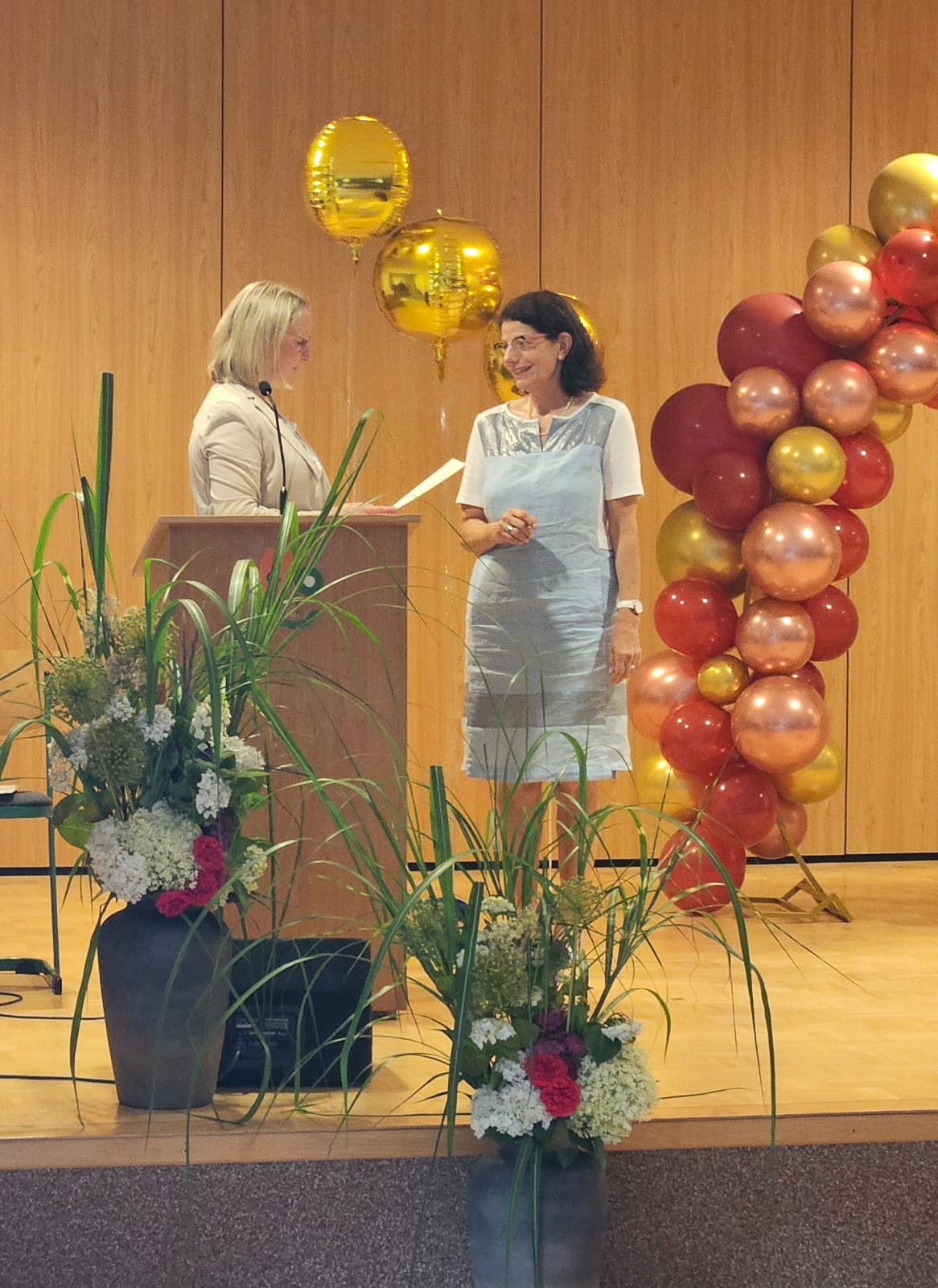 Viele waren geladen, viele waren gekommen, darunter auch ehemalige Weggefährtinnen und -gefährten. Zahlreiche Redner/innen verabschiedeten unsere Schulleiterin mit Grußworten, die ebenso persönlich wie herzlich ausfielen: