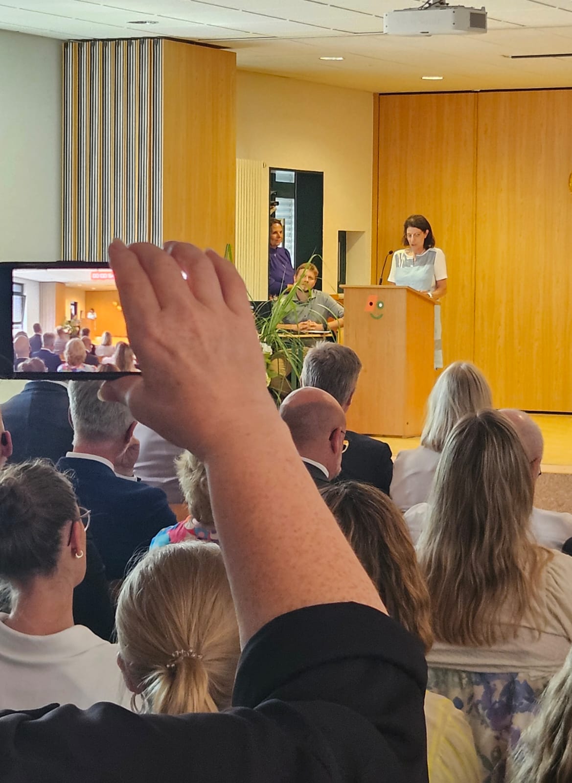 Das verbleibende Schulleitungsteam nahm vor aller Augen die KI zur Hilfe und trug humorvolle Verse über die sie verlassene Chefin vor. Auch das Kollegium trat erneut nach vorne, um ein gemeinsames Lied vorzutragen.